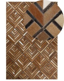 Tämä retrotyylinen matto on valmistettu aidosta lehmännahasta. Maton geometrinen kuvio on saanut inspiraationsa moderneista trendeistä, jonka ansiosta se on loistava koriste mihin tahansa kotiin. Maton yläosa on valmistettu käsin yhdistämällä useita erivärisiä nahkapaloja tyylikkään värimaailman luomiseksi, kun taas polyesterista valmistettu takaosa tarjoaa pitkäikäisyyden.